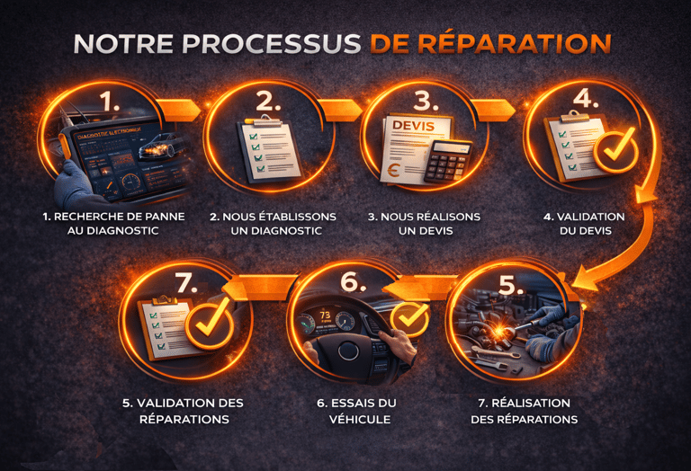 Notre processus de réparation est conçu pour garantir transparence, efficacité et qualité à chaque étape. De la recherche de panne au diagnostic précis, nous établissons un devis clair soumis à votre validation avant toute intervention. Une fois les réparations réalisées, le véhicule est soumis à des essais rigoureux afin d’assurer son bon fonctionnement. Ce processus structuré nous permet de vous offrir un service fiable, professionnel et conforme à vos attentes.